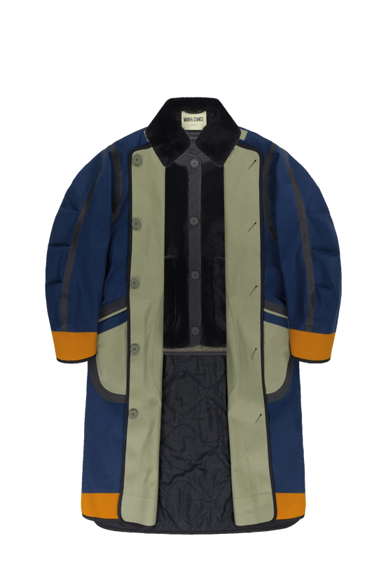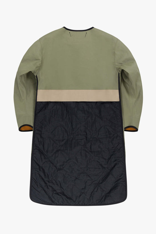 Meshing practical performance seamlessly with style, our take on a classic bonded raincoat is anything but traditional. Fully reversible, with taped seams, and welded patchworked surplus material panels, the raincoat can be worn alone as a water-resistant shell or can be layered over quilts and liners from our collection to create a winter coat. Reverse to the single colour side to experience two very different coats in one.