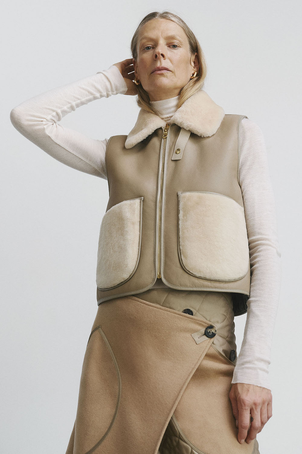 I always try to be client-led in my design process, considering their wants and needs, and how we can provide a solution. When I was in LA a customer expressed that they loved the look and feel of our Shearling styles, but that the Shearling Coat and Quilt was just too heavy for the climate there. This inspired me to create a piece made mostly of quilting, which is light and works across numerous climates, but features shearling on the chest to emulate the warmer look without adding bulk or too much insulation. For a cosier feel, you can reverse each piece to have the majority of the shearling facing inwards against your skin, as the shearling is still functional, not just for style.