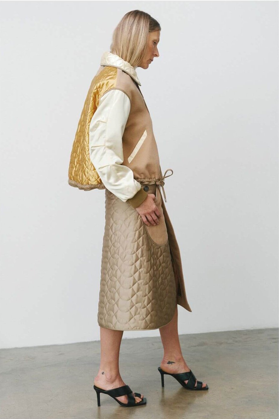 Crafted from luxurious surplus wools sourced from deadstock archives in London and Italy, the jacket is combined with compact, elevated glossy Italian satin, featuring placed quilted panels in a structured double onion quilt design. These contrasting panels play on the bold, graphic aesthetic of traditional varsity jackets, with colours like our signature safety orange, which references military influences but in a sportswear style.
