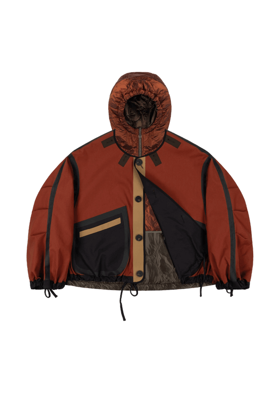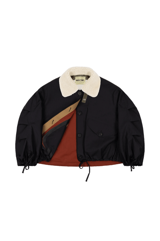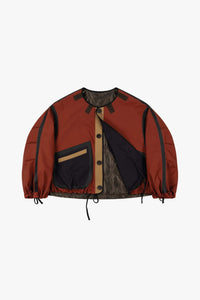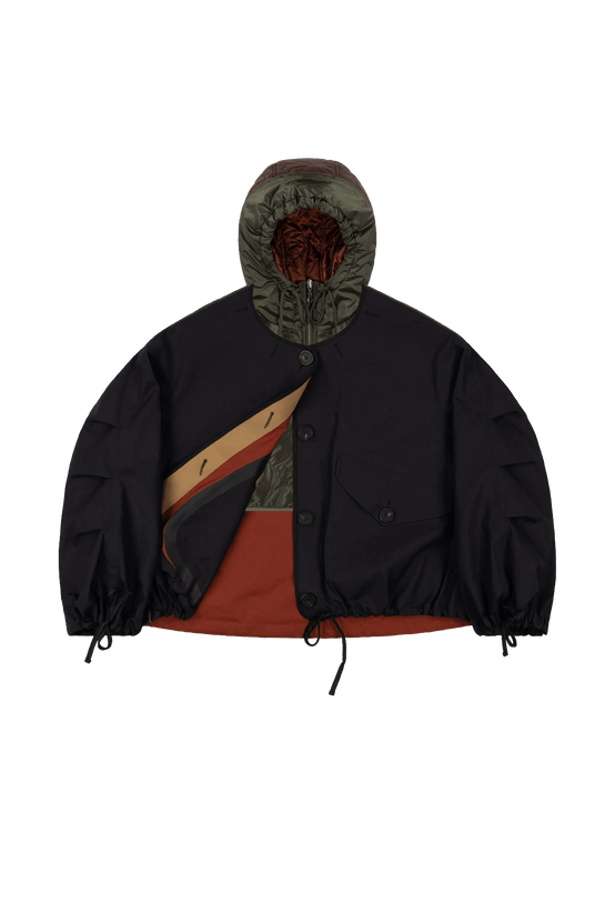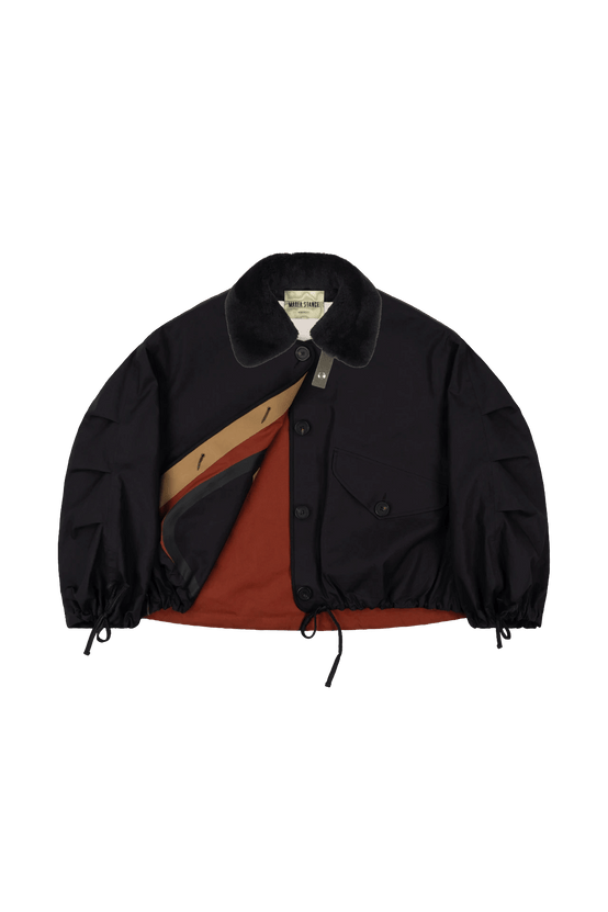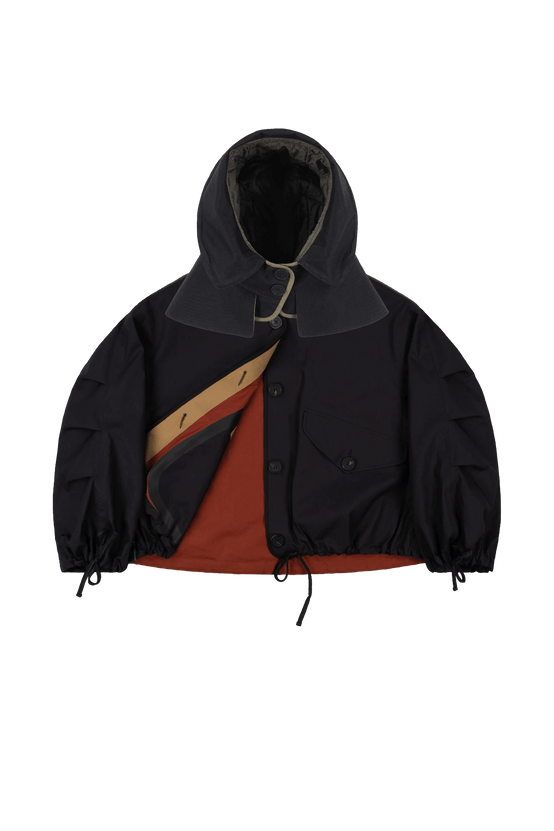 The reversible Rain Bomber offers many versatile ways to wear - taking the cropped and oversized silhouette of the Parachute Bomber the style can fitted by cinching the neck, hem and cuff using the functional parachute inspired drawcords; or wear it uncinched and loose for an oversized silhouette with an A-Line hem; or fully reverse for an entirely different look with one jacket.