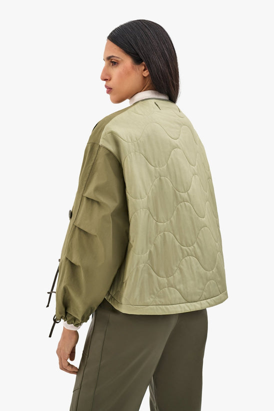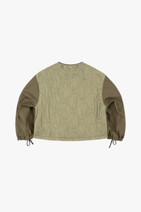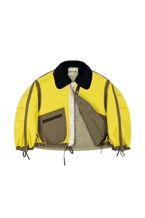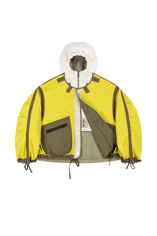 Fully reversible and modular, with taped seams and welded patchworked surplus material panels on one side, and a neutral single colour side with quilted nylon back panel on the other side, creating two very different jackets in one.