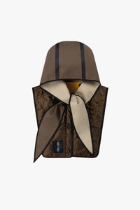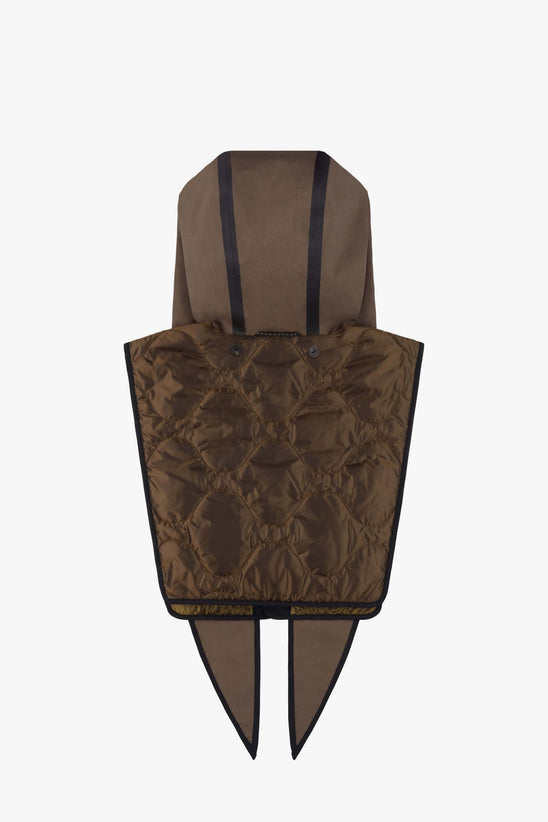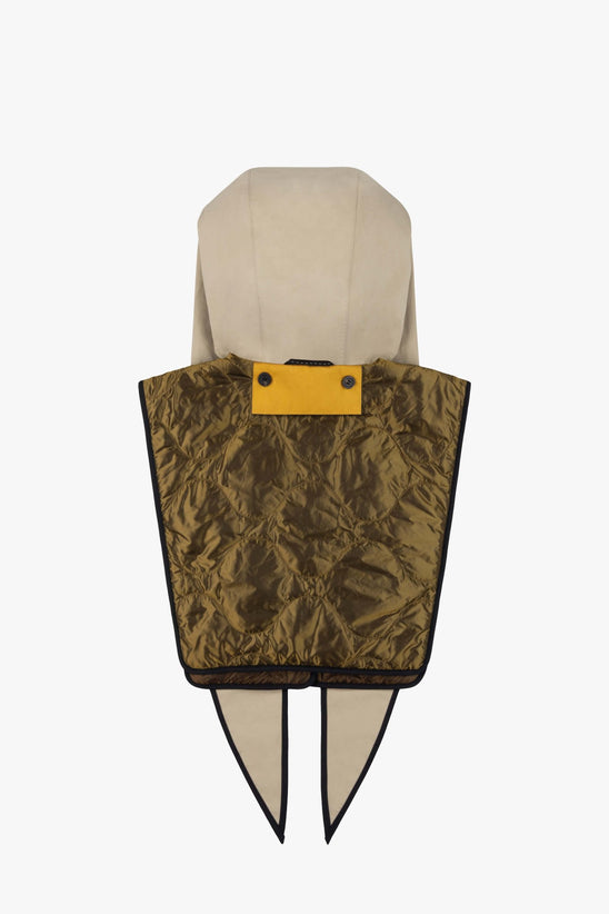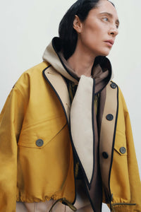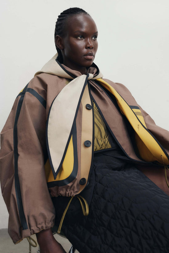 A modular weather solution and sculptural styling piece in one. This fully reversible, lightweight piece features a soft rain hood with a set of extended ties for versatile looks— wear loose, wrapped across the neck or knotted under the chin for a snug fit and added protection. The attached bib panel buttons up for added warmth and coverage.