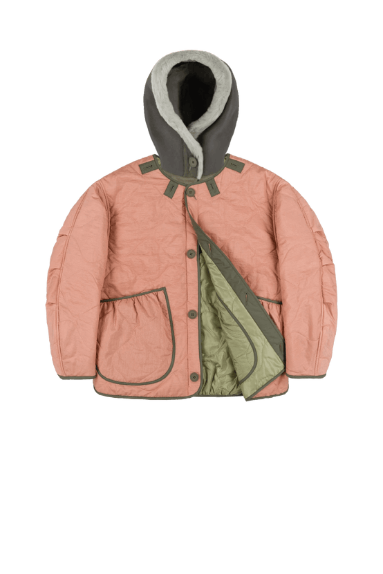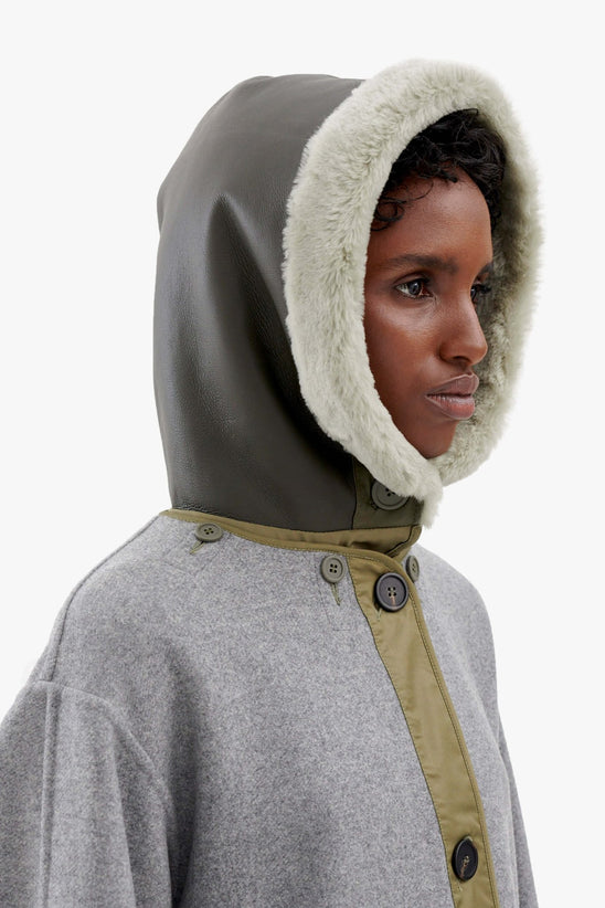 This multi-functional style combines comfort and warmth with a nostalgic attitude. Button the hood inside the neckline of your jacket. When you reverse your piece, unbutton the hood, and reattach in the inside neckline of the new side of your jacket. You can also wear the hood reversed too for more ways to wear.