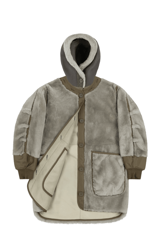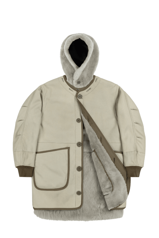 Make it Modular with the new and exclusive reversible and modular Shearling Hoodie. Luxurious, modern, and fully reversible, the Shearling Hoodie has been engineered using bi-colour, Italian, single-layer shearling, with a nappa leather or suede reverse. A light weight, unstructured and roomy hood silhouette with a shearling border, it is the ideal cosy add on to any style for all seasons.
