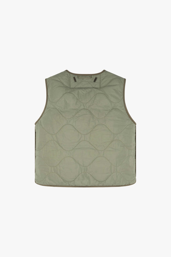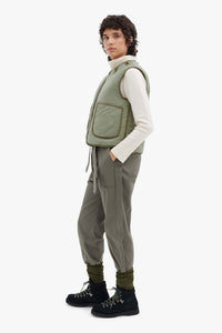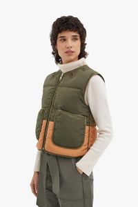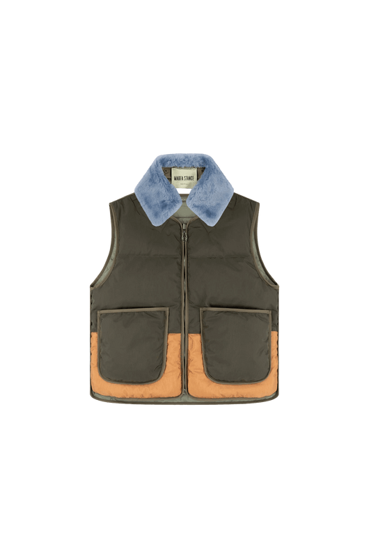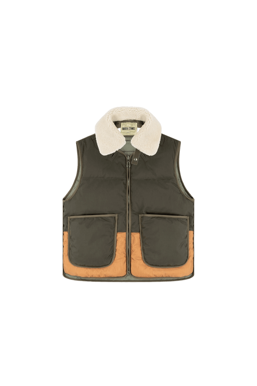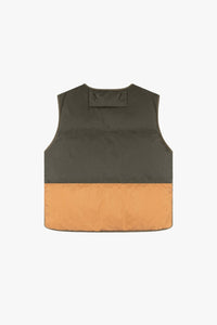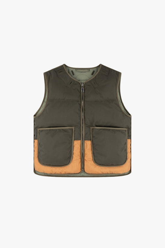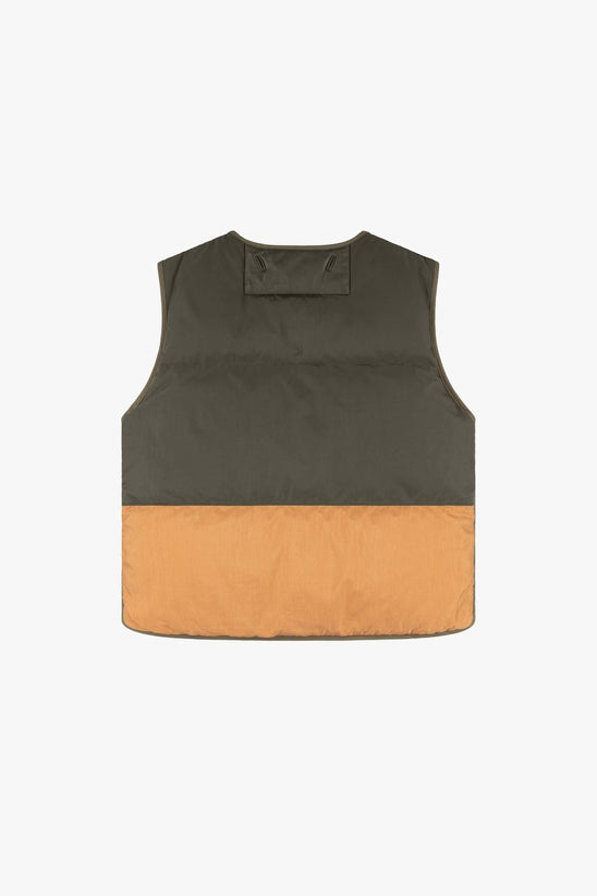 This style offers two unique and distinctive colourways in one garment. Using up left-over surplus nylons from past seasons productions, we created the exterior of the vest to have contrast colour blocking to reference high visibility panelling traditionally used in ski and mountaineering pursuits, whilst the internal is a single contrast colour with our signature onion quilting.