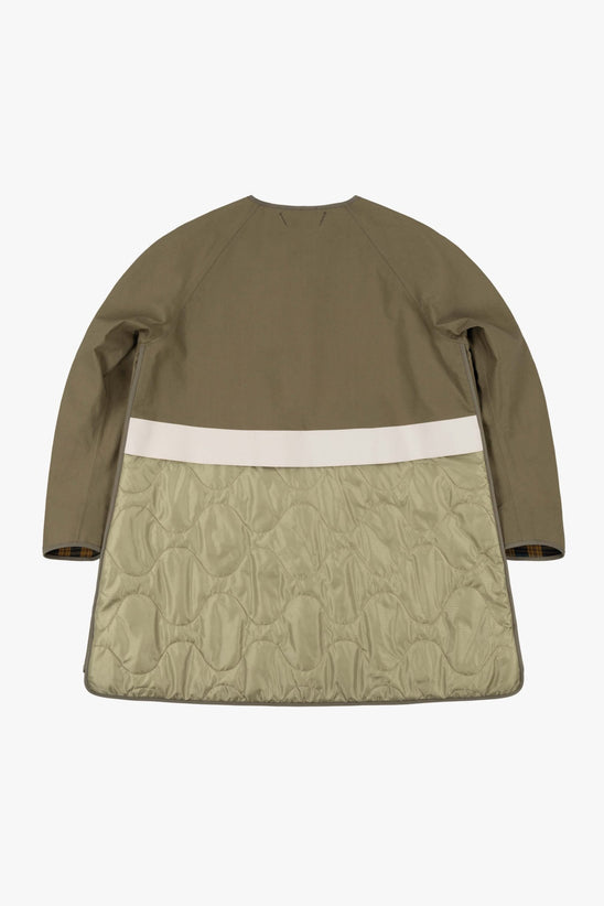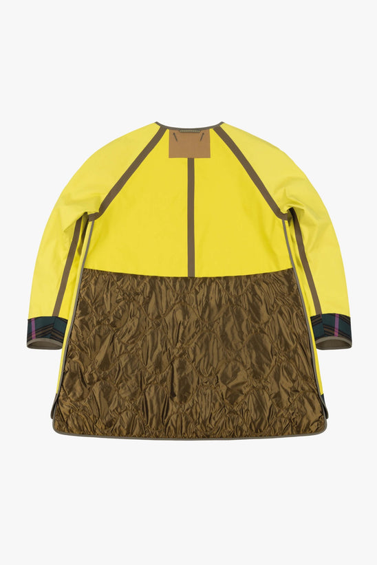 A cropped and A-Line version of our iconic reversible Raincoat, the Short Reversible Raincoat meshes practical performance seamlessly with style. Fully reversible, with taped seams, and welded patchworked surplus material panels, the raincoat can be worn alone as a water-resistant shell or can be layered over quilts and liners from our collection to create a winter coat. Reverse to the single colour side to experience two very different coats in one.