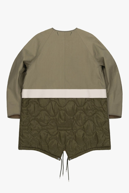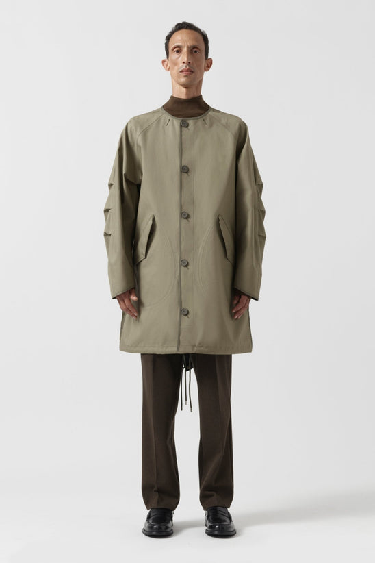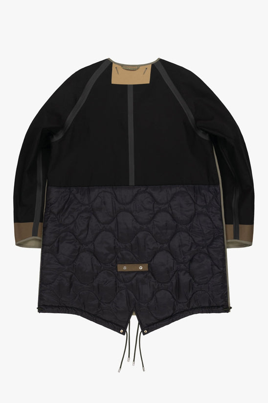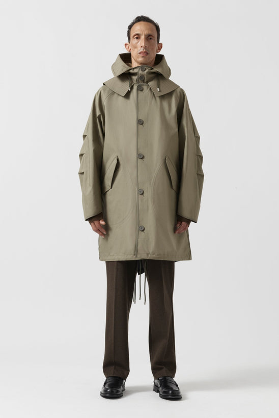 A modern rendition of rainwear. Made from bonded water-resistant Italian cotton with a durable nylon back panel and adjustable drawcord hemline. Finished with taped seams. Fully reversible.
