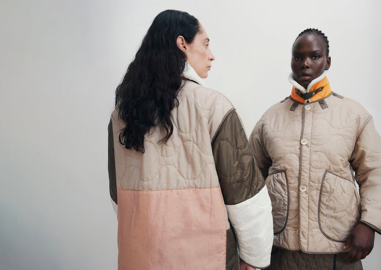 Oversized patch pockets offer generous storage. Quilted construction provides structure and insulation without bulk. Reversible, modular and designed for transitional movement - perfect for shifting seasons and ever-changing settings.