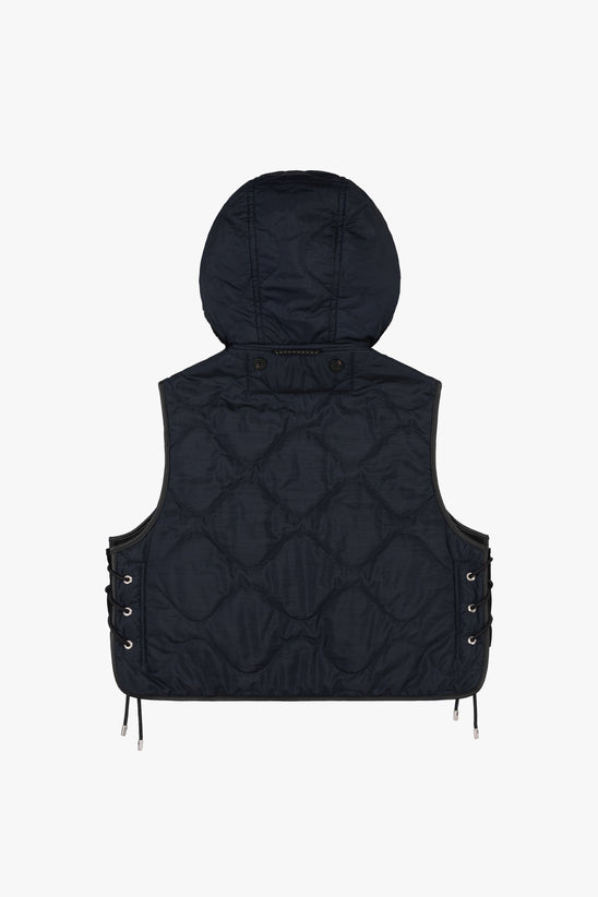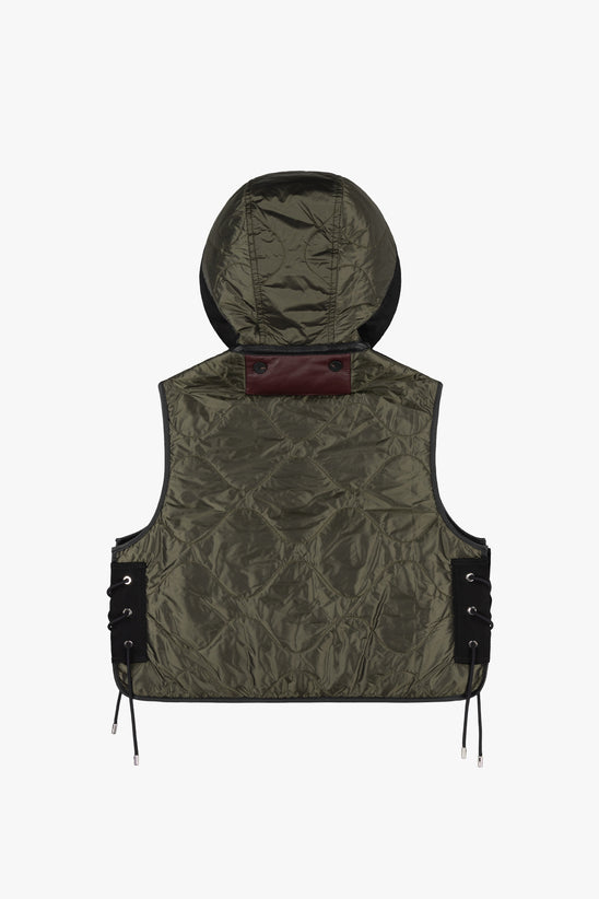 A luxe hooded vest with utility-inspired drawcord sides for adjustable style. Crafted from gold-standard Italian Nappa leather and shearling with a nylon back. Reversible design.