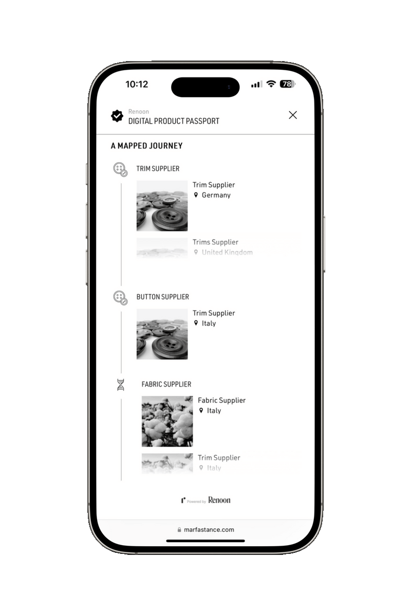 Renoon is a SaaS platform that provides Digital Product Passports for fashion and retail, enabling brands to map supply chains and share product impact stories via QR codes and e-commerce widgets. Marfa Stance uses Renoon to offer detailed transparency on materials, production, and sustainability for each product.