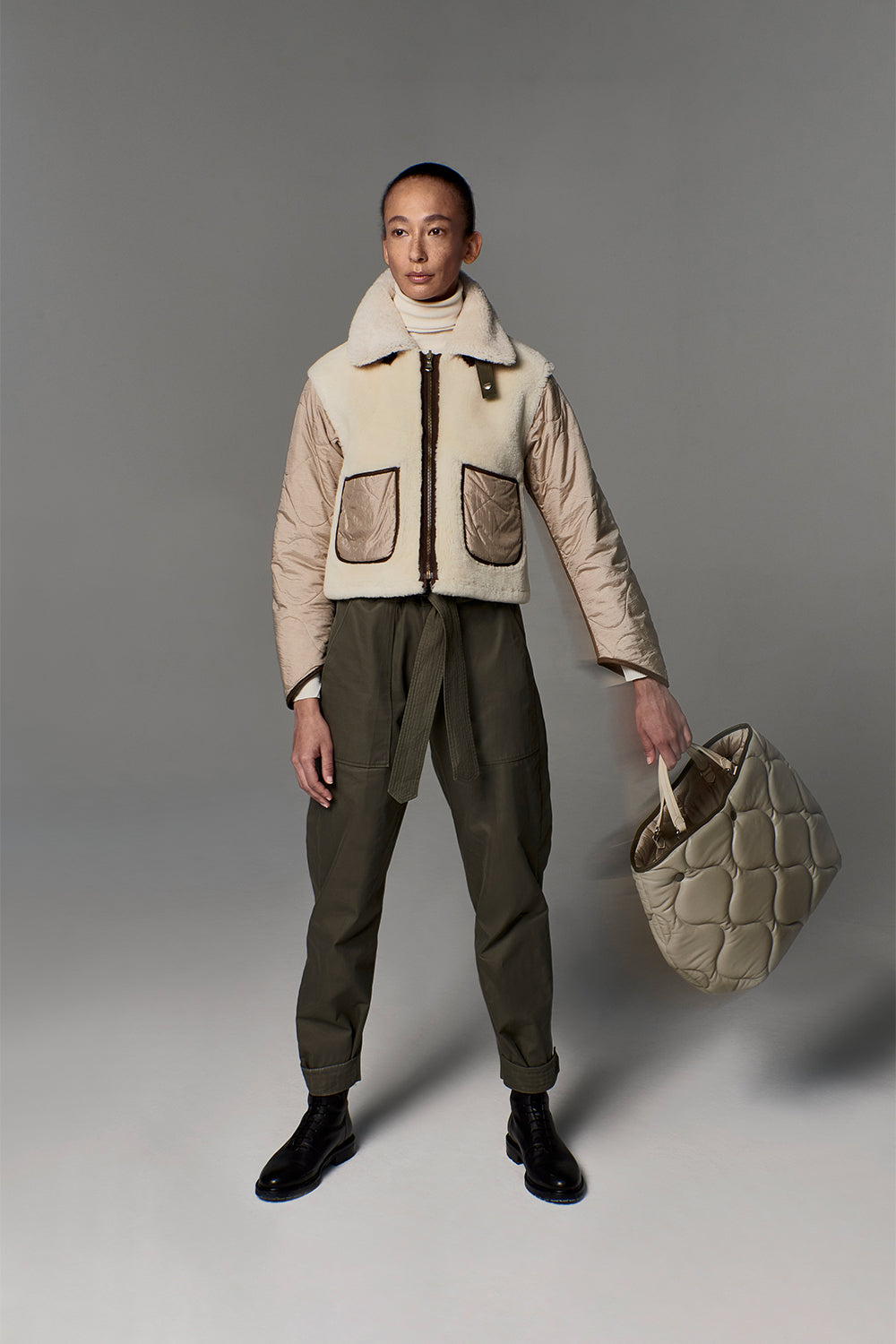 Defined by its clean structure and material interplay, the Aviator Collection offers tailored, cropped silhouettes softened by quilted nylon back and sleeves for comfort and ease. The luxe shearling front provides warmth and refinement, while reversibility and modularity make it easy to adapt the style. Adjustable latches, strategic quilting and bound seams reflect a thoughtful, detail-driven construction created for longevity.